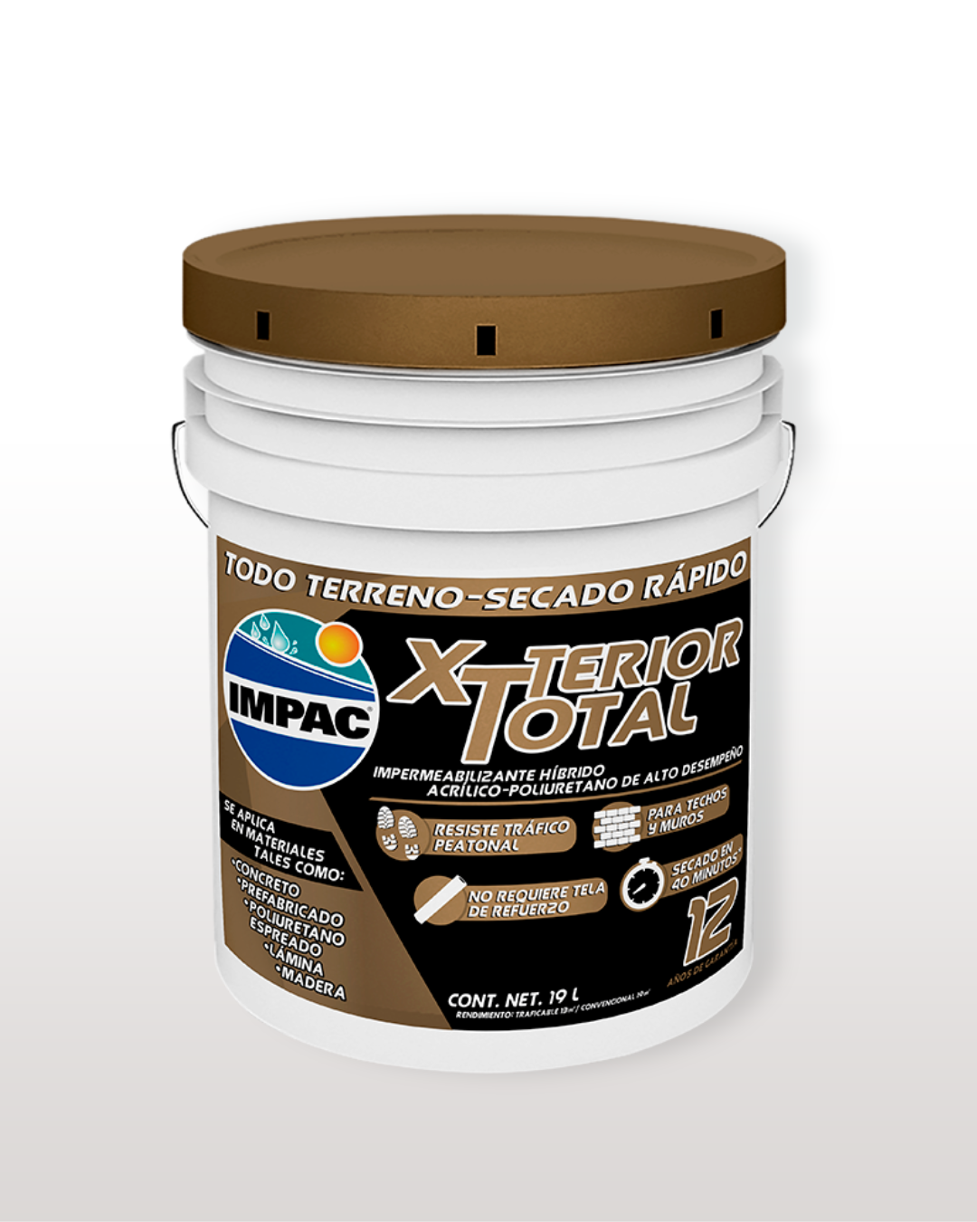IMPAC X-TERIOR Es un impermeabilizante elastomérico híbrido acrílico poliuretano de alto desempeño tanto para techos como para muros. Presentación: 5GL/19L